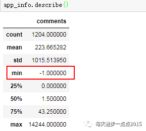 從上面代碼的運(yùn)行結(jié)果來看,數(shù)據(jù)集中,除了評(píng)論人數(shù)comments變量是數(shù)值型的,其他變量均為字符型;通過重復(fù)性檢查,數(shù)據(jù)集確實(shí)存在重復(fù)觀察,需要排重;通過評(píng)論人數(shù)的描述性統(tǒng)計(jì)來看,盡然最小值為-1,很明顯,這就是一個(gè)異常數(shù)據(jù),需要處理。