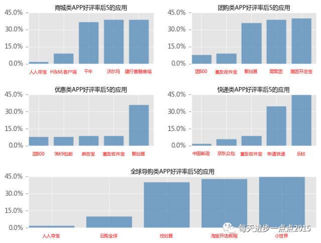 上圖反映的是,各類APP好評(píng)率最差的5個(gè)應(yīng)用,有幾個(gè)是我比較出乎意料,如商城類APP中,熟知的沃爾瑪、千牛和建行善融商城也在里面;聚劃算居然都出現(xiàn)在了團(tuán)購類和優(yōu)惠類APP中;對(duì)于快遞類的應(yīng)用來說,中國郵政口碑最差,其次是京東眾包(大概了解了一下京東眾包,這是一個(gè)全民快遞服務(wù)APP,可以理解成C2C的服務(wù))。