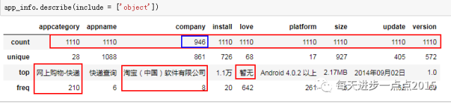 從離散變量的描述性統(tǒng)計(jì)來看,變量company存在缺失值;在電商類APP中,快遞類APP盡然最多,高達(dá)210個(gè),可想而知,電商帶動(dòng)了多少人的就業(yè)啊~;從電商類的公司來看,淘寶絕對(duì)是獨(dú)占鰲頭啊,至少有8類APP都是淘寶門下的;我們還發(fā)現(xiàn),好評(píng)率love一列存在642個(gè)“暫無”,即存在缺失值。