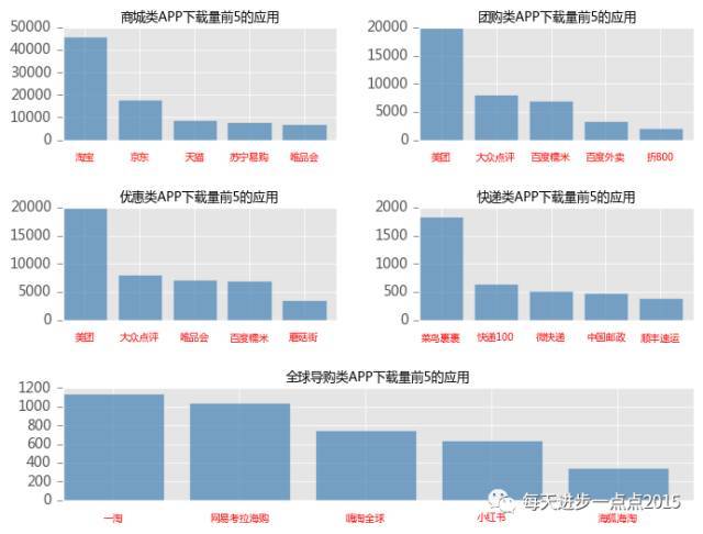 由上圖可知,從商城類和優(yōu)惠類的應(yīng)用中,唯品會(huì)APP在豌豆莢市場(chǎng)上的下載量都躍居前五;對(duì)于團(tuán)購類和快遞類美團(tuán)和菜鳥的下載量還是占絕對(duì)優(yōu)勢(shì)的;全球?qū)з忣?/strong>下載量前三的APP并沒有太大差異,且下載量并不大,個(gè)人覺得主流商城APP(如天貓,京東,唯品會(huì))都有海淘業(yè)務(wù),基本能滿足消費(fèi)者需求。
