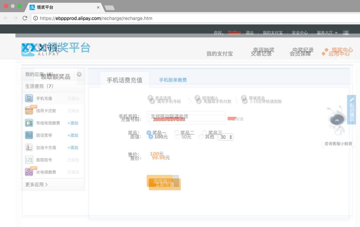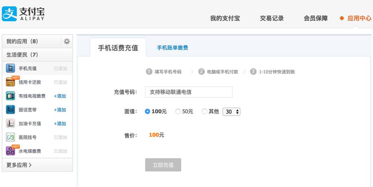 上圖是支付寶手機(jī)話費(fèi)充值的界面。