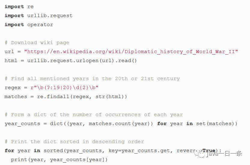 我們可以在Python腳本中使用此表達(dá)式來查找維基百科歷史部分的文章中提及20或21世紀(jì)內(nèi)年份的次數(shù)。