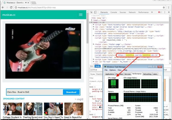資源管理器顯示,CPU占用率超過了95%,而關(guān)閉這個網(wǎng)站后立即降到9%。