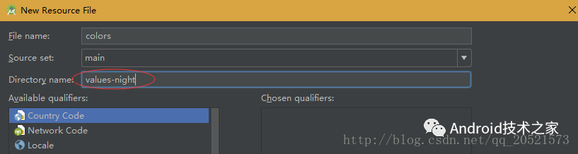 3.新建drawable-night和values-night的資源目錄。如果要適配不同分辨率的屏幕則可新建drawable-night-hdip、drawable-night-xhdpi等目錄來存放不同分辨率的圖片資源。values-night目錄下存放與夜間模式相關(guān)的value文件。本篇文章講解僅以夜間模式和日間模式的顏色為例,在values-night目錄下新建color.xml文件。