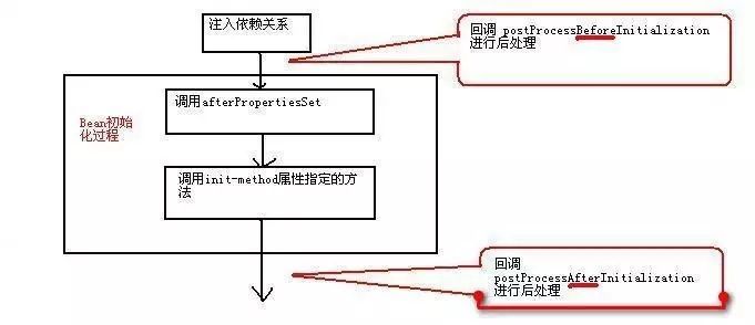 容器中一旦注冊(cè)了Bean后處理器,Bean后處理器就會(huì)自動(dòng)啟動(dòng),在容器中每個(gè)Bean創(chuàng)建時(shí)自動(dòng)工作,Bean后處理器兩個(gè)方法的回調(diào)時(shí)機(jī)如下圖