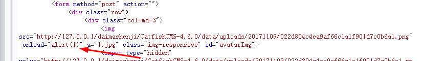 avatar=http://127.0.0.1/daimashenji/CatfishCMS-4.6.0/data/d/file/uploads/20171109/test.png" ="alert(2)" a="1.jpg