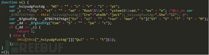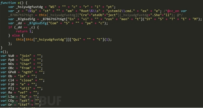 ? 可以看到,在這里也是對(duì)字符進(jìn)行拼接,最后湊出來的關(guān)鍵字。 這個(gè)函數(shù)的大概意思就是通過創(chuàng)建 W.Shell 對(duì)象來查看環(huán)境變量中的 COMSPEC 值,這個(gè)值是返回命令行解釋器可執(zhí)行程序的準(zhǔn)確路徑,就是 cmd.exe 的路徑。然后與系統(tǒng)目錄下的 system32cmd.exe 進(jìn)行比較。判斷 cmd.exe 的路徑。