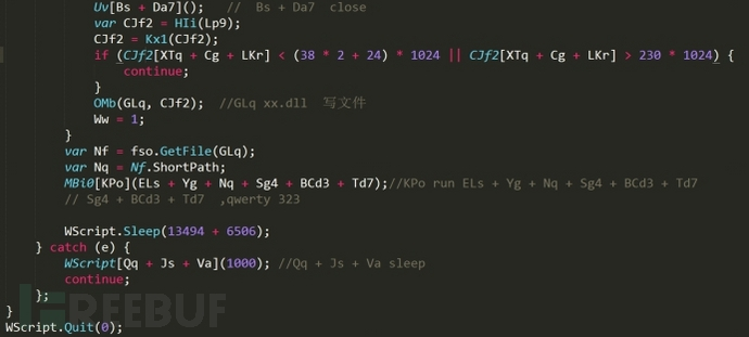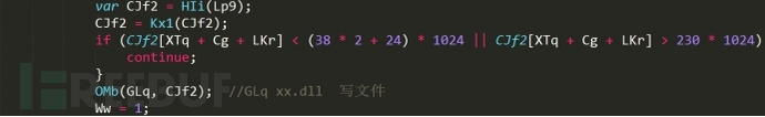 這里的意思就是通過擴(kuò)充環(huán)境字串 %TEMP%/,并在該目錄下,創(chuàng)建出一串無意義名字的后綴為 dll 的字符串,即 xx.dll 賦值于 GLq 這個(gè)變量中,為后面的寫文件做鋪墊,繼續(xù)看下去: