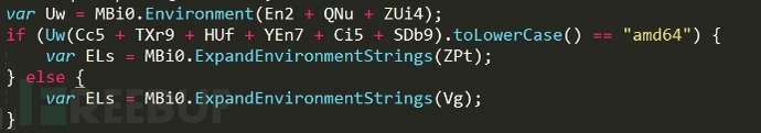 ? 接下來,就是查看環(huán)境變量中的 PROCESSOR_ARCHITECTUREiD,來判斷系統(tǒng)是 64,還是 32 位,最后選擇相對(duì)應(yīng)的 rundll32.exe,用于后面執(zhí)行惡意動(dòng)態(tài)鏈接庫的函數(shù)。其中