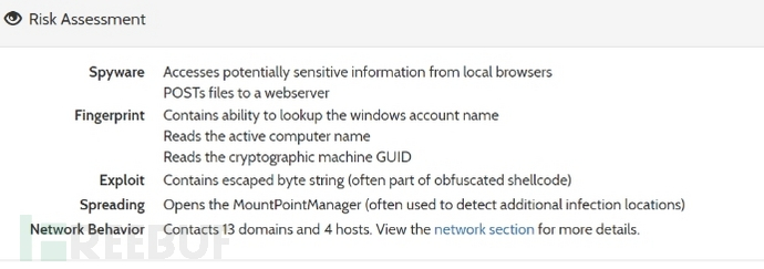 ? 由于找不到下載到本地的惡意代碼文本,特意到網(wǎng)上搜了N個(gè)該 JS 的特征代碼。最后終于發(fā)現(xiàn)了在國(guó)外的一個(gè)網(wǎng)站上發(fā)現(xiàn)了對(duì)類似 JS 執(zhí)行的內(nèi)存和行為分析,雖然還是沒有下載的惡意代碼文本,但是已經(jīng)能夠大致確定該 JS下載的惡意代碼的作用了。地址