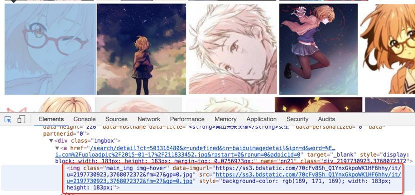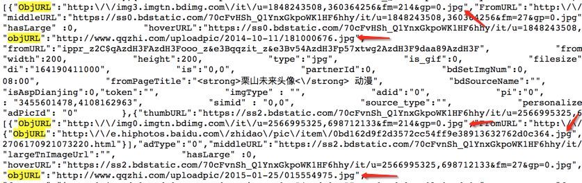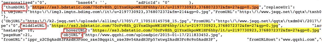 通過分析可以知道,前面兩個是縮小的版本,hoverURL 是鼠標移動過后顯示的版本,objURL 應該是我們需要的,可以分別打開這幾個網(wǎng)址看看,發(fā)現(xiàn) objURL 的那個最大最清晰。