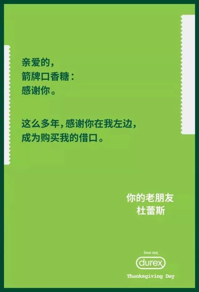寫著情書說著情話,看似熱鬧好玩,其實在無形中,讓消費者了解自己的產(chǎn)品優(yōu)勢,潛移默化產(chǎn)生品牌認(rèn)同感。這和之前杜蕾斯在感恩節(jié),一口氣調(diào)戲 13 個品牌,用揶揄的口氣互夸的效果差不多。