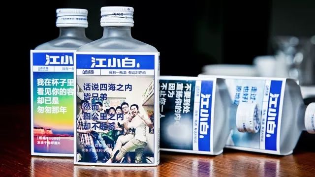 江小白酒把自己定位為“青春型白酒”,和傳統(tǒng)白酒的路線不同,他們希望能讓80、 90 后認(rèn)同自己。所以酒瓶包裝上有一個戴著眼鏡、圍著圍巾的小伙子形象,就和身邊的朋友同事看起來差不多。