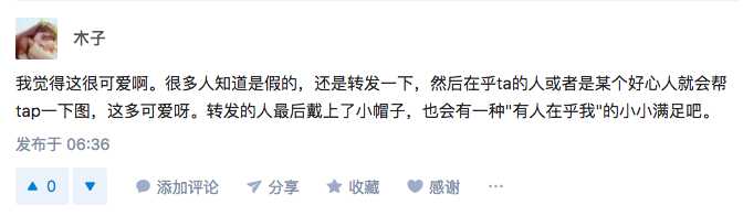 也有網(wǎng)友表示,覺得這個很可愛啊。很多人知道是假的,還是轉(zhuǎn)發(fā)一下,然后在乎ta的人或者是某個好心人就會幫tap一下圖,這多可愛呀。