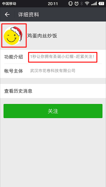 無獨有偶,昨天晚上,還有一個自稱是微信官方支持秘密組織的“wechat moments”也發(fā)了一個帶有二維碼的圣誕帽的圖片引流,但大叔關(guān)注后發(fā)現(xiàn),只有調(diào)戲用戶,并無法幫助用戶P上帽子。類似“無恥”的案例,好像不少?!?/P>