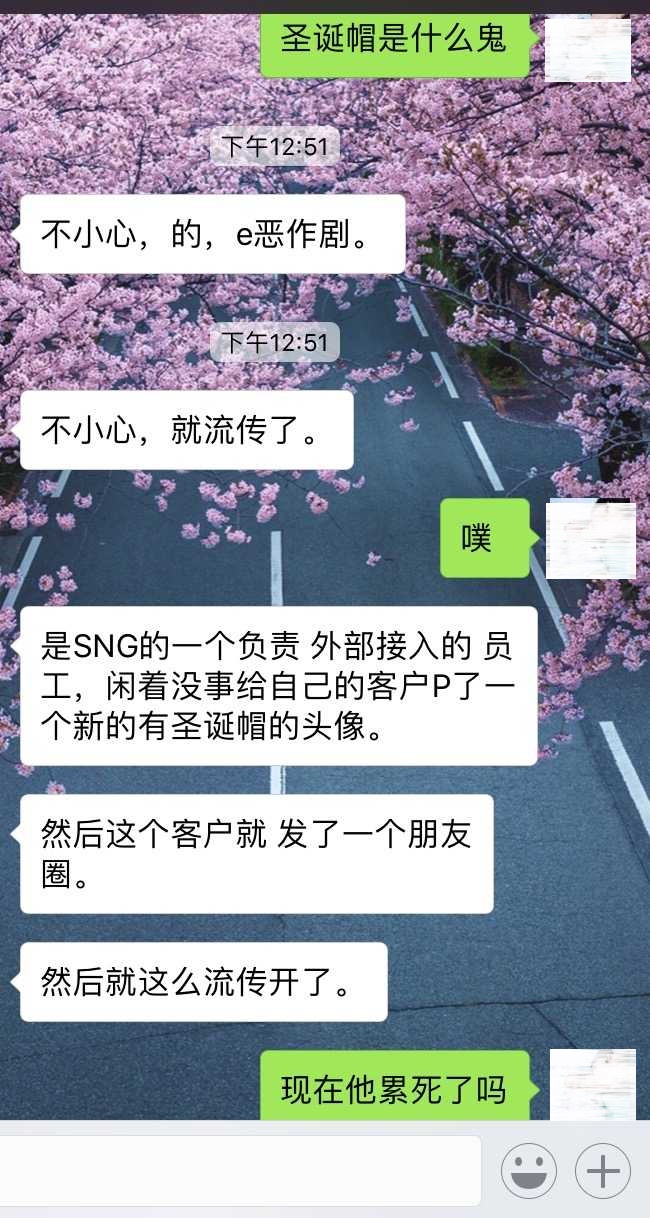 騰訊SNG一個負責(zé)外部接入的員工,閑著沒事給客戶P了一個圣誕帽頭像,然后這個客戶就發(fā)了個朋友圈,之后就流傳開了。