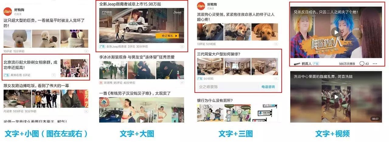 指夾雜在用戶瀏覽、閱讀內(nèi)容中的廣告??赡艹霈F(xiàn)在今日頭條、網(wǎng)易新聞等新聞客戶端;UC、百度、搜狗等移動搜索瀏覽器;微博、微信、陌陌等社交類 APP;或者優(yōu)酷、愛奇藝等視頻類 APP 中。主要包括:文字+小圖(圖在左或右)、文字+大圖、文字+三圖、文字+視頻等展現(xiàn)形式。