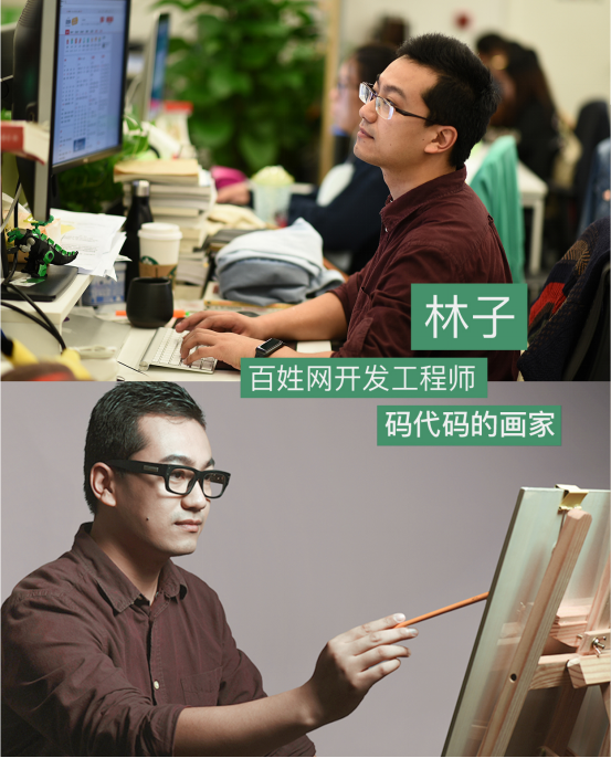林子碼代碼的姿勢(shì)很挺很標(biāo)準(zhǔn),仿佛用創(chuàng)造藝術(shù)的方法在碼代碼。他在百姓網(wǎng)擔(dān)任開(kāi)發(fā)工程師,同時(shí)也可能是畫(huà)畫(huà)最好的碼農(nóng)。