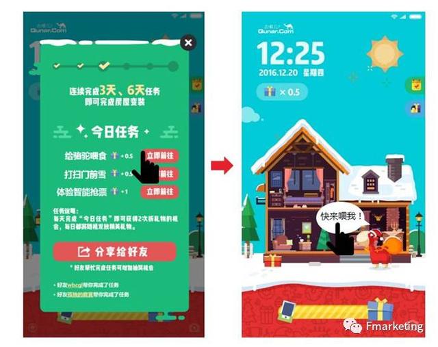 在具體操作上,小米結(jié)合圣誕、元旦的節(jié)日氛圍,將本次營銷創(chuàng)意的核心定義為“主題互動營銷”,為去哪兒網(wǎng)量身打造“暖冬禮屋”互動主題,以突破傳統(tǒng)的趣味方式吸引用戶參與。其中,“暖冬禮屋”既是一個(gè)手機(jī)主題,同時(shí)也成為一個(gè)互動游戲平臺,用戶可以在鎖屏頁面參與“養(yǎng)成類互動游戲”,如“喂駱駝”、“掃雪”、“養(yǎng)成房屋和節(jié)日換裝”等,在獲得游戲樂趣的同時(shí),還可抽取“巴厘島旅游大獎”、“火車票優(yōu)惠券”等豐富的雙旦節(jié)日禮品。此外,為了更好傳播主題,小米整合小米直播、MIUI官方微博、小米主題站等優(yōu)質(zhì)的全媒體資源進(jìn)行推廣。