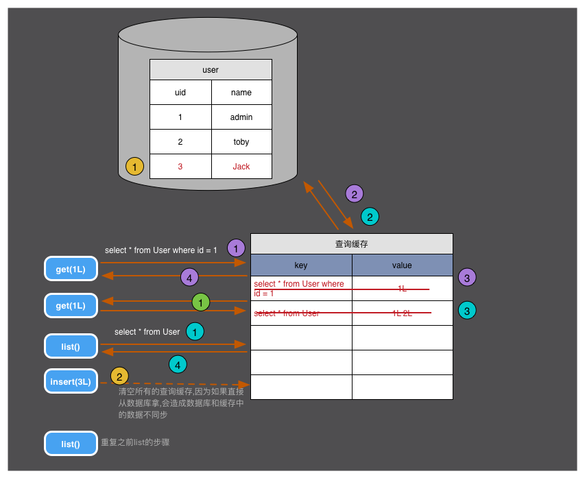 首先list()的時(shí)候,由于查詢緩存中沒(méi)有,那么我們?nèi)?shù)據(jù)庫(kù)查,并將數(shù)據(jù)放在了查詢緩存中,然后將結(jié)果返回